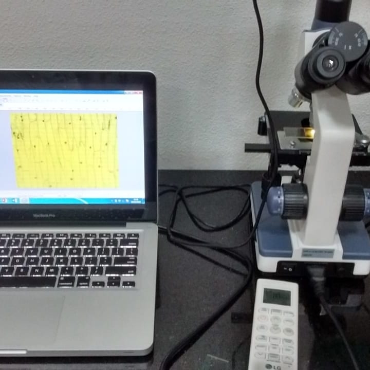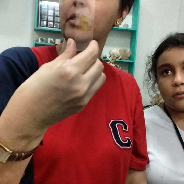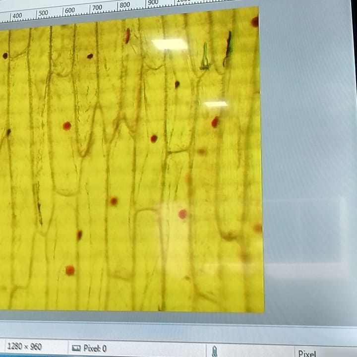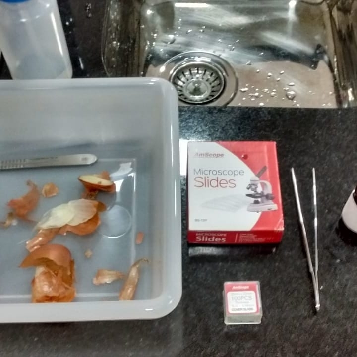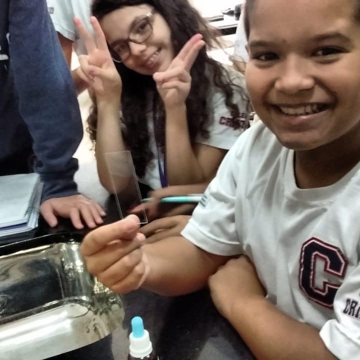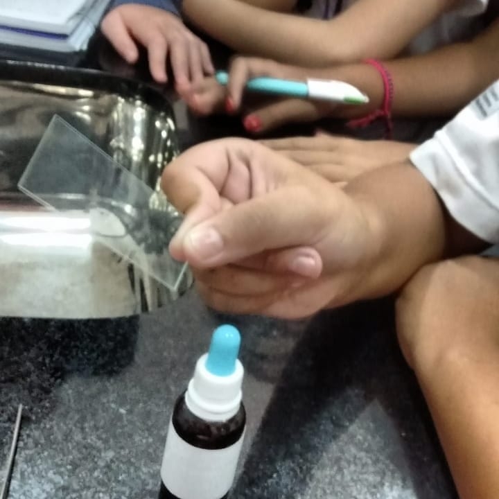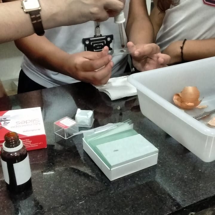 Os alunos utilizaram a cebola e tintura de iodo para fazer uma lâmina, depois de pronta observaram no microscópio óptico as estruturas anotando suas observações.